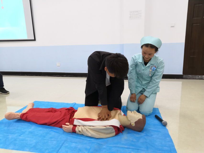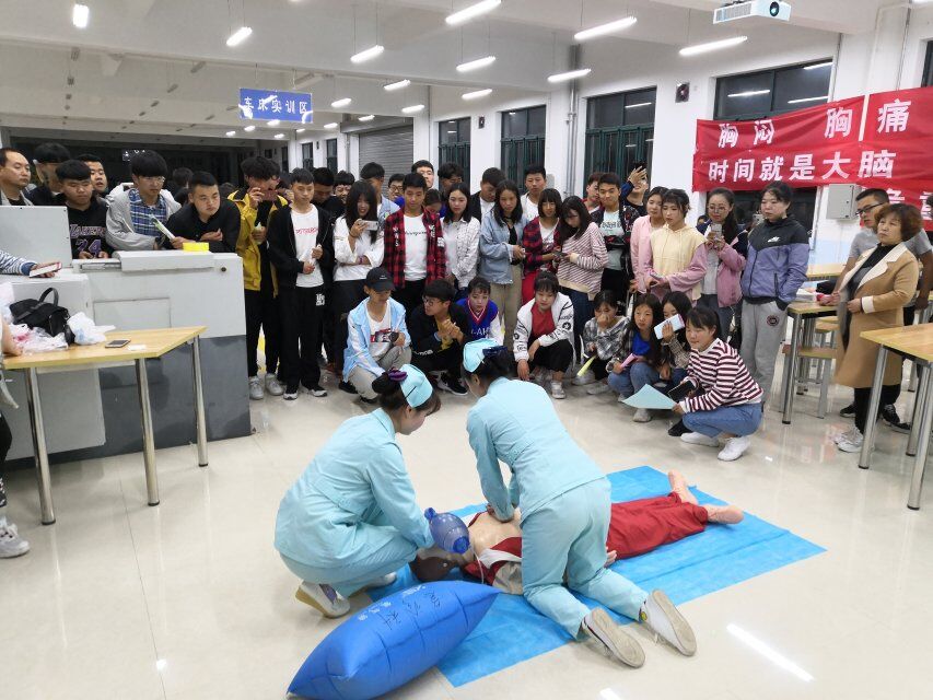 本次讲座分为三个环节,在第一环节中,由专家首先生动的讲述自己的就诊经验,分析了胸痛、心绞痛、脑中风、急性心肌梗塞等病状,并着重讲解了预防及紧急情况应对方法;第二个环节,播放健康知识宣传片,提高大家的自我救助的意识,认识自己的误区;最后一个环节,由护士教大家做心率复苏方法,让同学们进行学习模拟演练。