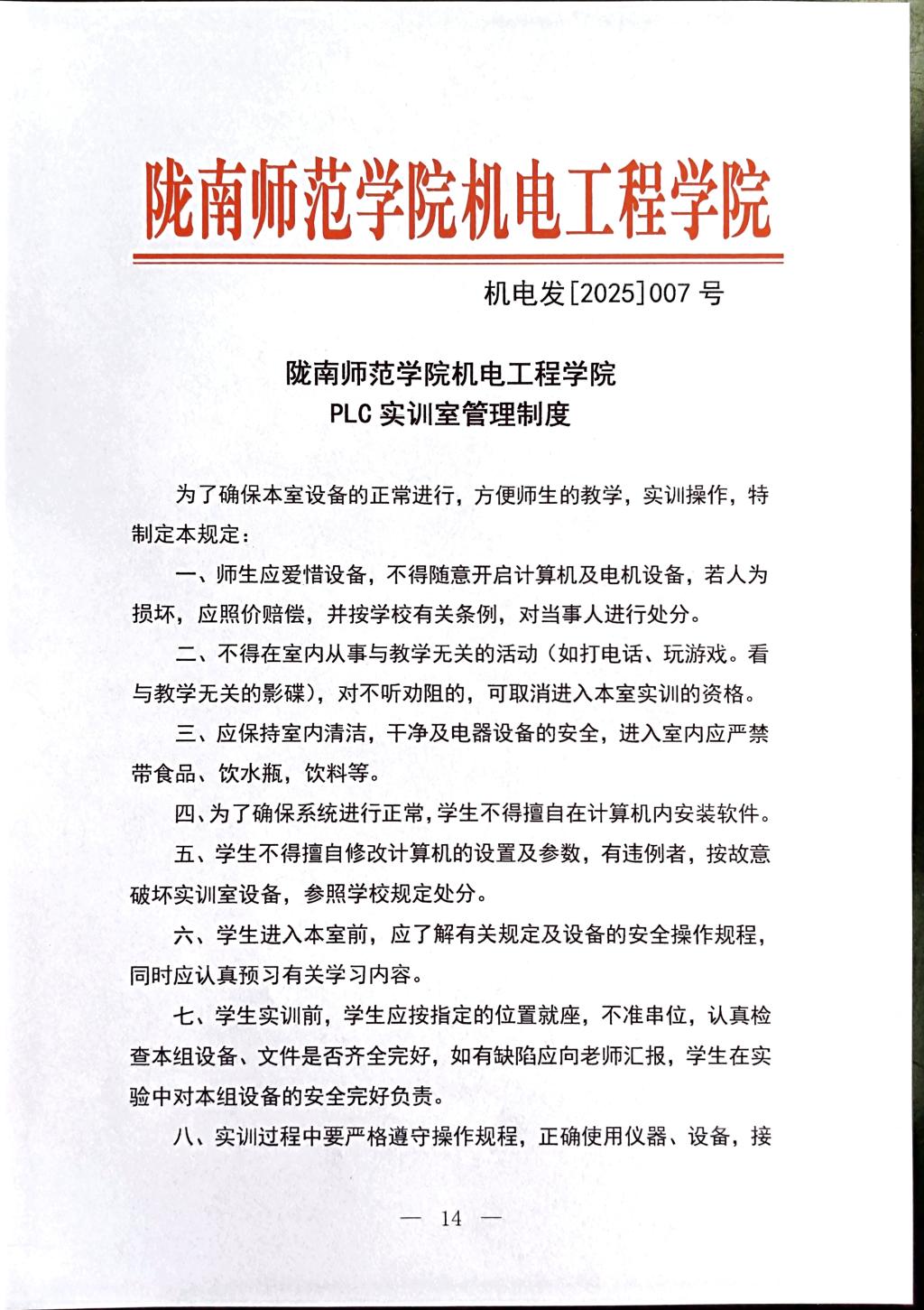 陇南师范学院机电工程学院PLC实训室管理制度 机电发[2025]007号.pdf