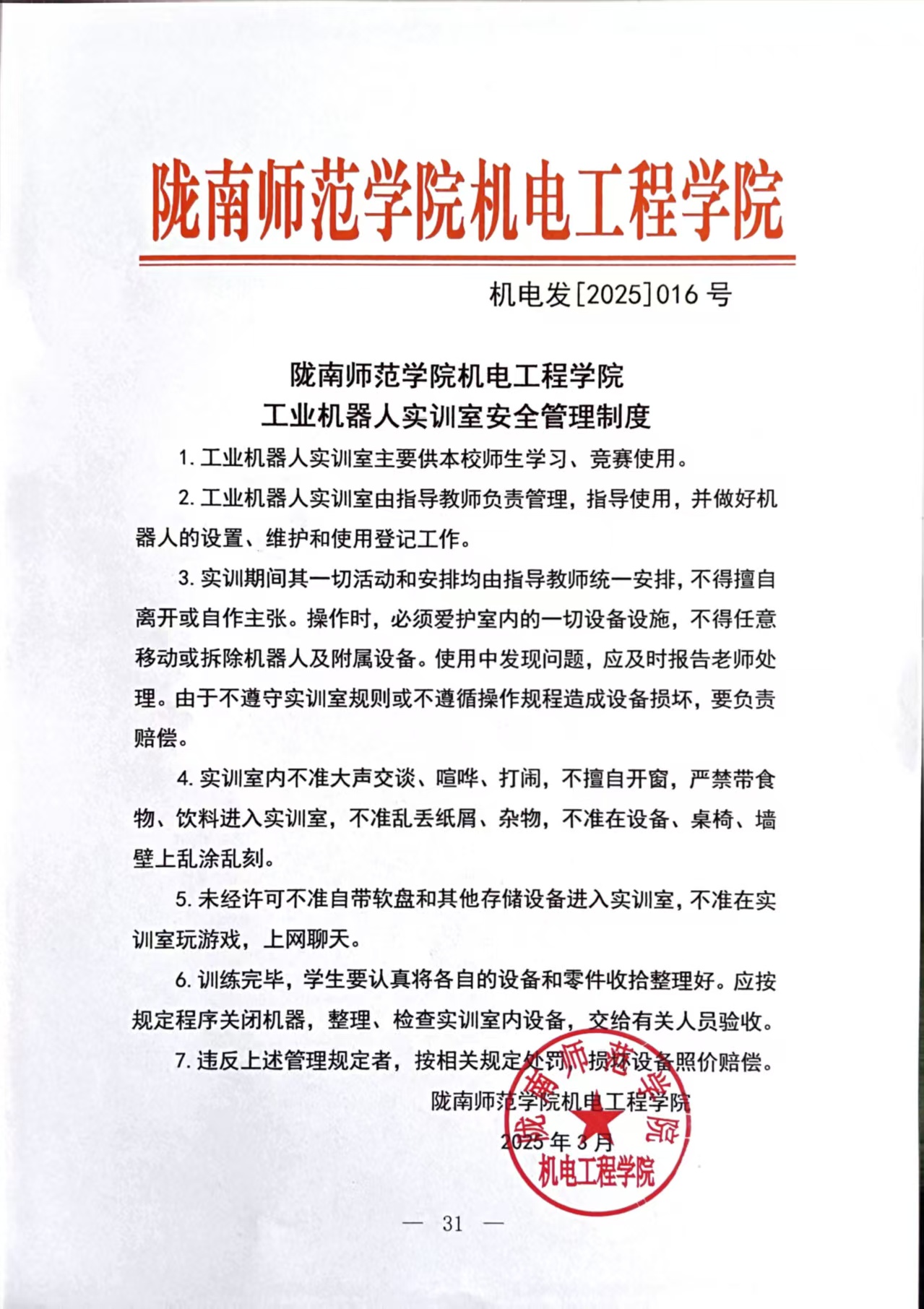 陇南师范学院机电工程学院工业机器人实训室安全管理制度 机电发[2025]016号.pdf